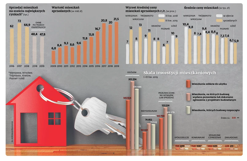 W III kwartale deweloperzy działający w sześciu największych miastach Polski (Warszawa, Poznań, Wrocław, Trójmiasto, Kraków, Łódź) sprzedali 16,1 tys. mieszkań. To o 1 tys. więcej niż w II kwartale – wynika z najnowszych danych JLL. Dzięki tak dobremu wynikowi udało się odrobić stratę względem roku poprzedniego. Pierwsza połowa roku była bowiem słaba. W sumie od początku roku deweloperzy sprzedali 47,8 tys. mieszkań na największych rynkach. Daje to wynik już tylko o 1,3 proc. gorszy od tego z ubiegłego roku. Wszystko wskazuje więc na to, że będzie się realizował najkorzystniejszy dla rynku i deweloperów scenariusz spowolnienia – stopniowe zmniejszanie się popytu wraz z odpowiednią redukcją podaży. O ile nie dojdzie do skokowego spadku któregoś z tych wskaźników.