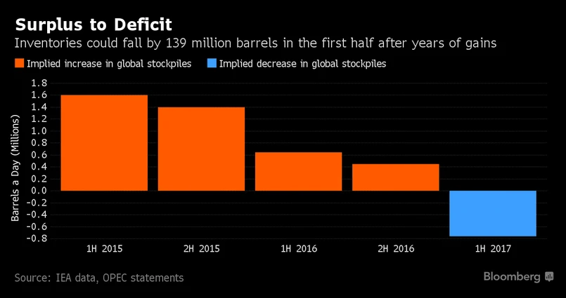Rekordowe zapasy gromadzone od 2014 roku będą malały w pierwszej połowie przyszłego roku w tempie około 760 tys. baryłek dziennie, jeśli OPEC oraz 11 innych producentów ropy spełni zobowiązania, jakie przyjęli podczas grudniowego porozumienia – wynika z szacunków Bloomberga opartych na danych Międzynarodowej Agencji Energetycznej. W ciągu 6 miesięcy obowiązywania umowy zapasy surowca, które w tej chwili wynoszą 300 mln baryłek, zmaleją o 46 proc.