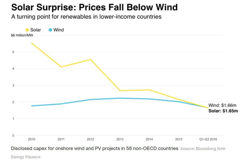 Załączony wykres pokazuje średni koszt nowych paneli słonecznych i turbin wiatrowych na 58 rynkach wschodzących, łącznie z Chinami, Indiami i Brazylią. I choć spodziewano się, że z czasem koszt wytworzenia energii słonecznej będzie niższy niż energii wiatrowej, to nikt nie spodziewał się, że nastąpi to tak szybko.