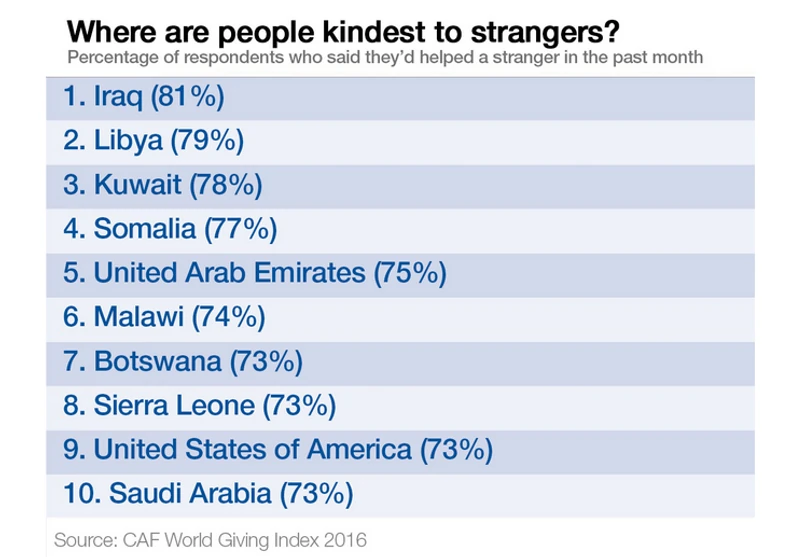 W pierwszej 10-tce państw, których obywatele najchętniej pomagają obcym, aż 4 to kraje z czołówki rankingu najbardziej niebezpiecznych państw świata. 81 proc. Irakijczyków i 79 proc. Libijczyków deklaruje, że w ostatnim miesiącu pomogli nieznajomej osobie. W Kuwejcie i Somalii jest to odpowiednio 78 proc. i 77 proc. Kolejne miejsca zajmują Zjednoczone Emiraty Arabskie, Malawi, Botswana i Sierra Leone. Mieszkańcy bogatych Stanów Zjednoczonych zajmują dopiero 9 miejsce w zestawieniu. Pierwszą dziesiątkę zamyka Arabia Saudyjska.