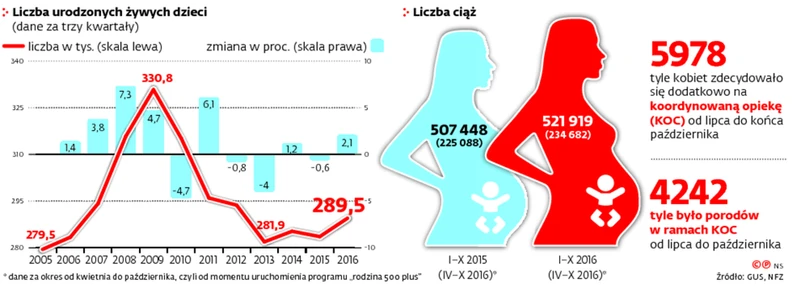 Eksperci wskazują jednak, że już wiadomo, iż ten rok będzie pierwszym od 2008 r., w którym liczba urodzonych dzieci wzrośnie najbardziej rok do roku. W trzech kwartałach zwiększyła się już o 5,9 tys. Dla porównania w 2015 r. w tym czasie zmalała o 1,7 tys.