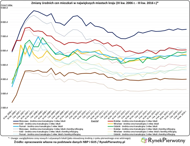 Na poniższym wykresie można zauważyć, że spadki cen widoczne po III kw. 2008 roku, dość szybko wyhamowały. Powodem była decyzja rządu o znaczącym rozszerzeniu programu Rodzina na Swoim. Wspomniany program pomógł sprzedawcom w utrzymaniu wyższych cen mieszkań i wygasł, gdy zarobki stały się już bardziej adekwatne do kosztów zakupu metrażu. Pomimo amortyzującego działania Rodziny na Swoim, spadki cen mieszkań były nieuniknione. Te zmiany stają się lepiej widoczne, gdy dodatkowo weźmiemy pod uwagę inflację CPI naliczaną od III kw. 2006 r. (patrz przerywane linie na poniższym wykresie). Po wykonaniu odpowiednich obliczeń można stwierdzić, że pomiędzy II kw. 2008 r. i III kw. 2016 r. średnia cena transakcyjna 1 mkw. mieszkania zmieniła się o: