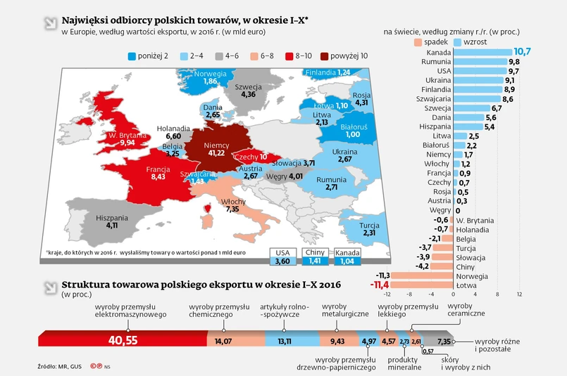 Nasz eksport powiązany jest mocno z Niemcami. Na ten kraj przypada aż ponad 27 proc. całej sprzedaży na rynkach zagranicznych. Odczuwamy więc wszystkie turbulencje, jakie przeżywa gospodarka sąsiada. A właśnie w ubiegłym roku niemiecki eksport, którego jesteśmy poddostawcami, złapał zadyszkę – po ośmiu miesiącach był tylko o 1 proc. większy niż przed rokiem w sytuacji, gdy w całym 2015 r. zwiększyły się o 6,5 proc. Efekt jest taki, że nasza sprzedaż za Łabą wzrosła od stycznia do końca października zaledwie o 1,7 proc., podczas gdy w tym samym okresie roku poprzedniego notowaliśmy jej wzrost o ponad 10 proc.