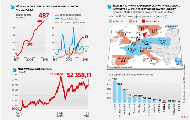 Już dzisiaj około południa powinno się rozstrzygnąć, kto zostanie nowym szefem warszawskiej Giełdy Papierów Wartościowych. Prezes spółki odpowiedzialnej za sprawne funkcjonowanie regulowanego rynku akcji, instrumentów pochodnych i obligacji ma przed sobą nie lada wyzwanie. Największe od kilku lat bolączki GPW to spadek obrotów – w 2016 r. na rynku akcji były o 10 proc. mniejsze niż rok wcześniej – oraz problemy z przyciągnięciem na rynek nowych, interesujących dla inwestorów firm i ucieczka z parkietu firm już notowanych. Kłopoty z pozyskaniem finansowania na rynku akcji spowodowały, że w minionym roku po raz pierwszy od 2003 r. więcej spółek zeszło z głównego parkietu, niż się na nim pojawiło. Wycofań było w sumie 20 wobec 19 debiutów. Nie najlepiej Warszawa wygląda też, jeśli chodzi o notowania.