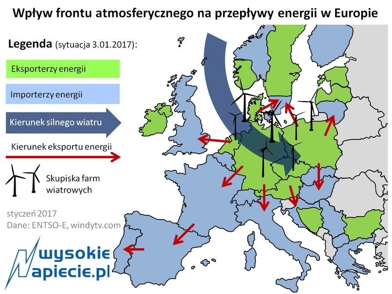 Stosunkowo duża generacja energii z farm wiatrowych na północy Europy i jednocześnie niska temperatura na południu sprawiły, że we wtorek energia płynęła z Europy Północnej i Środkowej na południe. Eksporterami były państwa położone na trasie silnego wiatru wiejącego znad Morza Norweskiego ─ Dania, Holandia, Niemcy, Polska, Czechy i Austria. Energię importowały natomiast Francja, Hiszpania, Włochy, Szwajcaria, Słowacja, Węgry i większość krajów bałkańskich, gdzie temperatura w nocy spadła znacznie poniżej zera.
