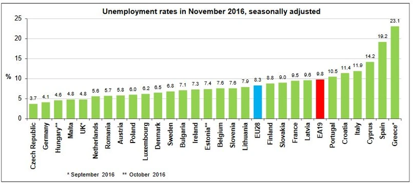 W całej Unii Europejskiej (UE) wskaźnik ten wyniósł 8,3% w listopadzie wobec 8,4% w październiku 2016 r. i wobec 9% rok wcześniej.