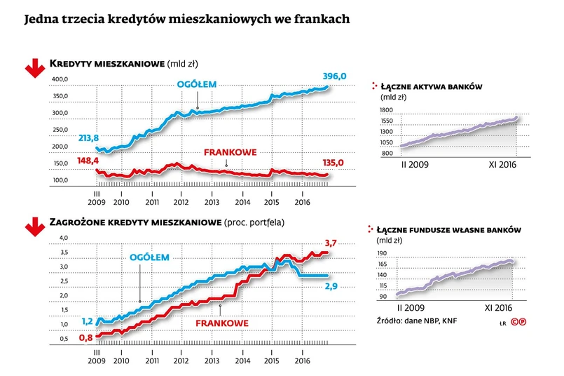 KSF zaproponował, by waga ryzyka – od której uzależnione jest to, ile kapitału bank musi odłożyć na zabezpieczenie kredytu – wzrosła ze 100 do 150 proc. Wartość kredytów frankowych to 135 mld zł. Zakładając, że przeciętny współczynnik wypłacalności w przypadku takich kredytów miałby wynosić 15 proc., kapitał zaangażowany w te kredyty musiałby urosnąć z 20 mld zł do 30 mld zł. Ale nadal byłby własnością akcjonariuszy. Przewalutowanie po kursie niższym od obecnego wiązałoby się z utratą części funduszy.