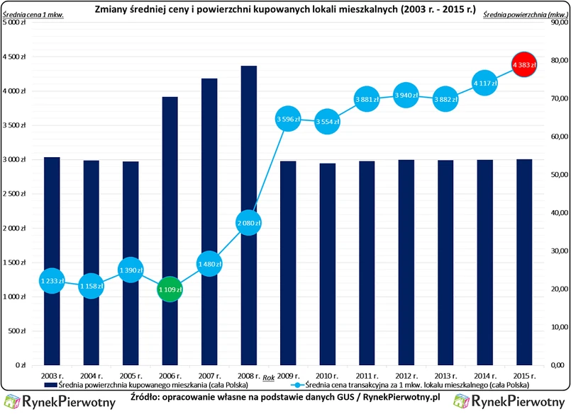 Ciekawe dane na temat ogólnopolskich cen mieszkań, pochodzą z rocznych zestawień, które GUS przygotowuje na podstawie aktów notarialnych. Takie notarialne dane wydają się znacznie bardziej wiarygodne, niż ceny metrażu szacowane w inny sposób. Główny Urząd Statystyczny podaje średnie transakcyjne ceny 1 mkw. lokali tylko w cyklu rocznym (a nie na przykład kwartalnym). Mimo tego uogólnienia, na poniższym wykresie możemy łatwo zauważyć trzy fazy zmian średnich cen mieszkań z całej Polski. Po stabilizacji tych stawek na poziomie 1100 zł/mkw. - 1400 zł/mkw. (lata 2003 - 2006), nastąpił szybki wzrost spowodowany boomem mieszkaniowym – tłumaczy Andrzej Prajsnar z portalu RynekPierwotny.pl. W 2009 roku średni koszt zakupu 1 mkw. mieszkania, wynosił już prawie 3600 zł/mkw. Ten poziom utrzymał się dzięki dopłatom z programu Rodzina na Swoim (RnS). Gdy program RnS przestał działać, istniała już lepsza relacja między poziomem płac nabywców i cenami metrażu. W tym kontekście warto pamiętać, że mieszkania zwykle kupują osoby posiadające dość stabilną sytuację zawodową i przynajmniej przeciętne dochody, a nie tzw. prekariusze. Program Rodzina na Swoim z pewnością był czynnikiem wpływającym na wzrost cen z lat 2010 - 2012 (2010 r. - średnia cena 1 mkw. mieszkania - 3554 zł, 2012 r. - 3940 zł). Podobne efekty cenowe miał program MdM. Jego popularyzacja jest jedną z przyczyn, które tłumaczą spory wzrost średniej ceny 1 mkw. w 2015 r. (4117 zł - 2014 rok, 4383 zł - 2015 rok).