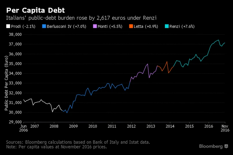 W okresie trwania rządów byłego premiera (luty 2014-listopad 2016) zwiększyło się także o 7,6 proc. zadłużenie per capita. Dla porównania, podczas ostatniej kadencji Berlusconiego wzrost ten wyniósł 7 proc. Zbiegło się to jednak w czasie z najsilniejszym kryzysem ostatnich dekad w całej strefie euro, który zmusił najsłynniejszego włoskiego polityka ostatnich dwóch dekad do rezygnacji.