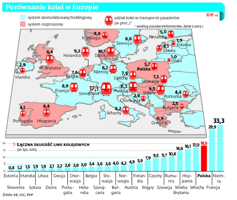 Spójrzmy na Niemcy. Do grupy Deutsche Bahn od strony infrastrukturalnej należą spółki DB Netze Fahrweg (zarządzająca siecią), DB Netze Personenbahnhöfe (dworce) i DB Energie (dostawy prądu trakcyjnego). W Polsce infrastruktura znajduje się w zarządzie PKP PLK (część holdingu PKP z dużą autonomią względem spółki matki), a dworce i stacje są w gestii PKP. Z kolei PKP Energetyka jest częścią PKP tylko z nazwy, bo w 2015 r. została sprywatyzowana (PiS chce unieważnić tamtą transakcję). Problem jest z PKP PLK, które mają problem z realizacją obietnic. Według NIK z powodu opieszałości w prowadzeniu przetargów i realizowaniu inwestycji z unijnej perspektywy finansowej 2007–2013 PLK nie wykorzystały 11 mld zł na inwestycje w infrastrukturę. A na półmetku perspektywy 2014–2020 PLK wydały na nie tylko 4 mld z 66 mld zł.