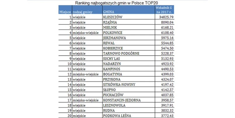 Pierwszym miastem w zestawieniu jest Podkowa Leśna. Dochody na poziomie 3 772,43 zł dały tej podwarszawskiej miejscowości 20. miejsce w klasyfikacji. Dla porównania w Warszawie było to 3 126,34 zł per capita (43. lokata).