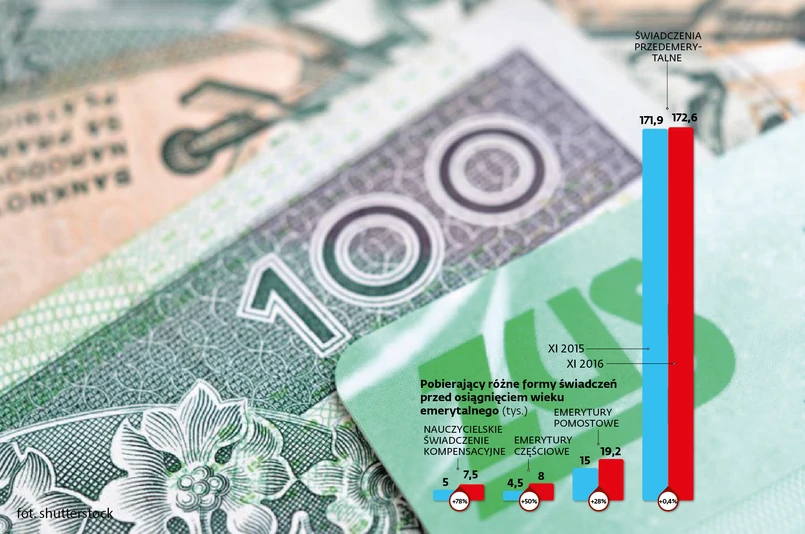Wzrost w czwartej kategorii – świadczeń przedemerytalnych – był symboliczny, wyniósł niespełna procent. To jednak nie dziwi z uwagi na wysokość wypłat. W 2016 r. sięgała nieco ponad tysiąc złotych, podczas gdy pozostałe formy zastępujące wcześniejsze emerytury dawały średnio dwa razy wyższy dochód. Świadczenie nauczycielskie wyniosło przeciętnie 2,1 tys. zł. Minimalnie niższa była przeciętna emerytura częściowa, a pomostowa dawała 2,4 tys. zł.