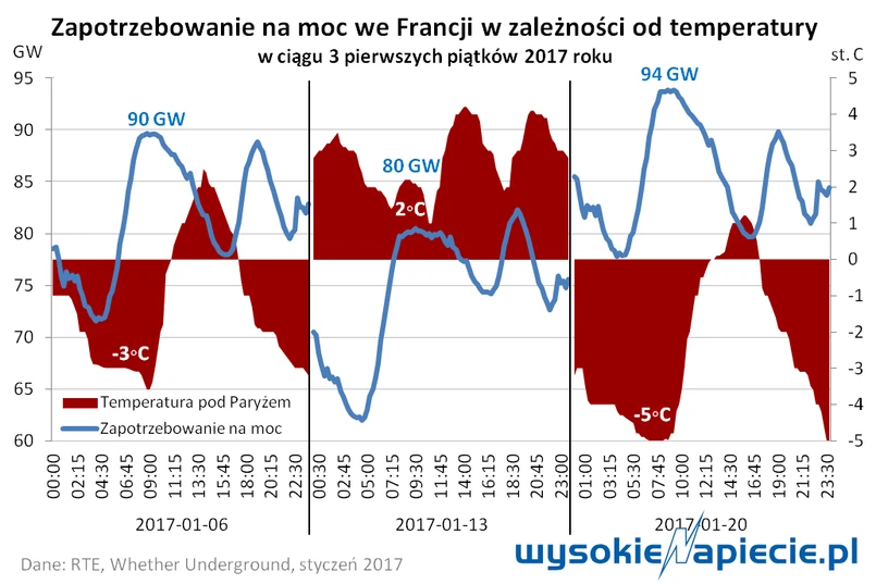 Zimą spadek temperatury o 1 stopień Celsjusza zwiększa zapotrzebowanie na prąd potrzebny do ogrzewania mieszkań w całej Europie o dodatkowe 5 GW, z tego aż za połowę odpowiadają Francuzi. Gdy mrozy są silne, potrafią oni konsumować ponad 100 GW. Dla porównania historyczny rekord zapotrzebowania całej Polski to zaledwie jedna czwarta tego.