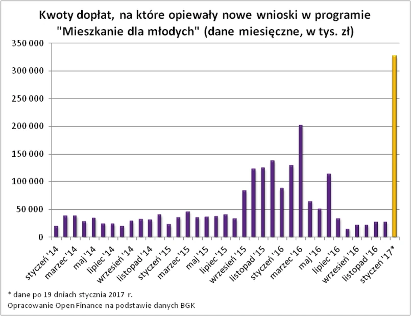 Tempo, w którym Polacy wykorzystują pieniądze na dopłaty z programu „Mieszkanie dla młodych” zaskoczyło wszystkich. Jeszcze w 2016 roku mówiono, ze pieniędzy wystarczy na 2-3 miesiące, podczas gdy prawie wszystkie zniknęły w ciągu zaledwie 2-3 tygodni. Już dziś jest pewne, że styczeń br. będzie rekordowy pod względem wykorzystania środków. Ostatni komunikat BGK na koniec czwartku (19 stycznia br.) mówił o wykorzystaniu pieniędzy na poziomie 92,44%. Choć w ostatnich dniach tempo wchłaniania dopłat wyraźnie spadło.
