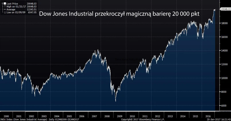Podczas środowej sesji Dow Jones Industrial przebił psychologiczną granicę 20.000 pkt., do której zbliżał się na początku roku. Rekordy biją również inne amerykańskie indeksy - w czasie środowej sesji Nasdaq Comp sięgnął do ok. 5.650 pkt., a S&P do 2.296 pkt., osiągając tym samym historyczne śródsesyjne maksima.