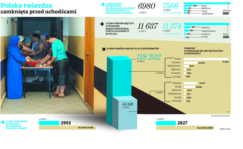 W 2016 r. odmówiano wjazdu 118 tys. razy, a w 2015 r. było to 53 tys. Osób było mniej, bo niektórych chętnych cofa się z granicy wielokrotnie. – To jest problem „niesłyszenia” wniosku cudzoziemca. SG twierdzi, że nie miał ważnej wizy, więc nie mogła go wpuścić. Cudzoziemiec zaś, że nie miał wizy, bo prosił o status uchodźcy, a wtedy nie musi jej mieć. Słowo przeciw słowu, ale masowość skarg wskazuje, że mamy do czynienia ze świadomą polityką SG – uważa Aleksandra Chrzanowska ze Stowarzyszenia Interwencji Prawnej. Jeśli SG faktycznie ignoruje prośby obcokrajowców o azyl, narusza prawo polskie i międzynarodowe.