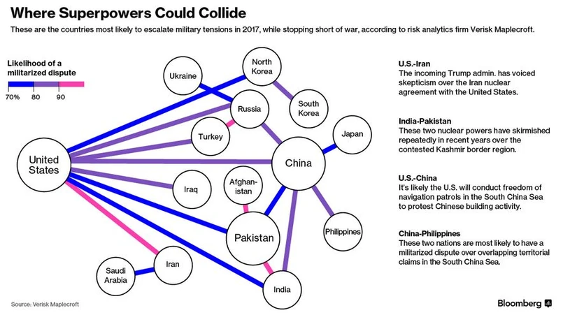 Według opracowania świat powinien liczyć się z największym ryzykiem wybuchu 4 konfliktów zbrojnych w 2017 roku – pomiędzy USA a Iranem, Pakistanem a Indiami,Pakistanem a Afganistanem oraz między Rosją a Turcją.