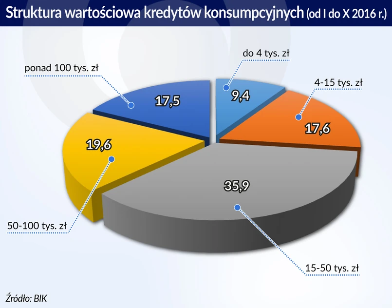 Według badań BIK nowa sprzedaż kredytów do 4 tys. zł stanowiła w ciągu pierwszych dziesięciu miesięcy 2016 roku zaledwie 9,4 proc. całkowitej wartości, natomiast kredytów na ponad 100 tys. zł – aż 17,5 proc. Co więcej, o ile liczba kredytów do 4 tys. zł spadła w tym okresie w ujęciu rok do roku o 2,6 proc., tych na 4-15 tys. zł spadła o 3,8 proc., a o 2,2 proc. kredytów na 15-50 tys. zł, o tyle znacząco wzrosła liczba kredytów konsumpcyjnych na wysokie kwoty. Tych na 100-200 tys. zł zwiększyła się aż o 12 proc., a tych przekraczających 200 tys. zł – o 26,8 proc. Widać, że banki nie tylko wycofują się z kredytów na niższe kwoty, ale zdecydowanie forsują sprzedaż tych na kwoty najwyższe.