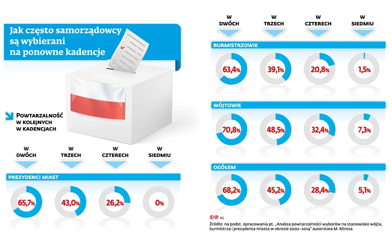 Jak wynika z jego badań, średnia powtarzalność wyboru na dwie kadencje wszystkich włodarzy w elekcjach, które miały miejsce w okresie 2002–2014, wynosi nieco ponad 68 proc. Z kolei na trzy kadencje z rzędu wybieranych było ponad 45 proc., a na czwartą – 28,4 proc. Siedmiokadencyjnych wójtów, burmistrzów i prezydentów jest 5,1 proc.