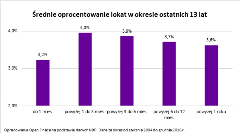 Z danych publikowanych przez NBP wynika, że to lokaty trzymiesięczne są w bankach produktami najwyżej oprocentowanymi. Odpowiednie statystyki NBP publikuje od początku 2004 roku. Wynika z nich, że przeciętne oprocentowanie produktów maksymalnie trzymiesięcznych (od ponad jednego miesiąca do trzech) wynosiło w tym czasie 4%. Dla porównania produkty wybitnie krótkoterminowe - nie dłuższe niż miesięczne - oferowały przeciętnie 3,2%. Na lokacie rocznej można było natomiast zarobić około 3,7%. Co niemniej ciekawe, w przypadku jeszcze dłuższych umów, banki oferowały niższe wynagrodzenie w postaci oprocentowania na poziomie 3,6%.