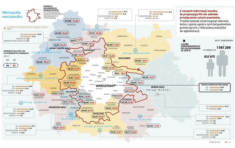 Nowelizacja ustawy warszawskiej zwiększa szanse PiS w wyborach samorządowych, bo spora część mieszkańców podwarszawskich gmin to sympatycy tej właśnie partii. Gdyby autorzy projektu ustawy ograniczyli się jedynie do wcielenia do aglomeracji gmin bezpośrednio graniczących ze stolicą, obszar nowej struktury samorządowej byłby trzy razy większy niż obecna powierzchnia stolicy. Liczba ludności wzrosłaby jedynie o blisko 20 proc., czyli o prawie 320 tys. osób z uwagi na dużo mniejszą gęstość zaludnienia w podwarszawskich gminach. Aglomeracja miałaby ponad 2 mln mieszkańców.