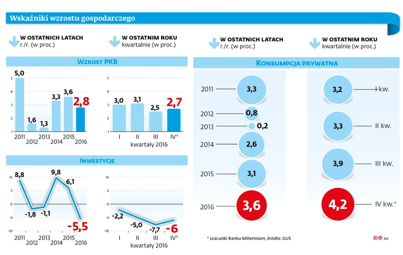 Ministerstwu i całemu rządowi na inwestycjach zależy szczególnie, bo to one mają być głównym motorem gospodarki w tym roku. GUS podał wczoraj wstępne dane o PKB w 2016 r. – i widać w nich, czym może skończyć się inwestycyjne załamanie. W całym roku wzrost gospodarczy wyniósł 2,8 proc. To lepiej, niż się spodziewano (eksperci szacowali wzrost na 2,6–2,7 proc.), ale znacznie gorzej, niż rząd zakładał konstruując budżet.