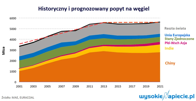 Jak jednak podkreśla MAE, chociaż popyt na węgiel w Państwie Środka wchodzi w fazę powolnego spadku, to uzależnienie od tego surowca się utrzyma i prognoza jego zużycia na 2021 r. jest wyższa, niż zakładano w 2015 roku. To może się jednak zmienić, jeśli potwierdzą się informacje sprzed kilku dni, iż w Chinach wstrzymywane są projekty budowy elektrowni węglowych o łącznej mocy 120 GW (trzy razy tyle ile mamy w całej polskiej energetyce). Zamiast nich mają powstać elektrownie jądrowe.