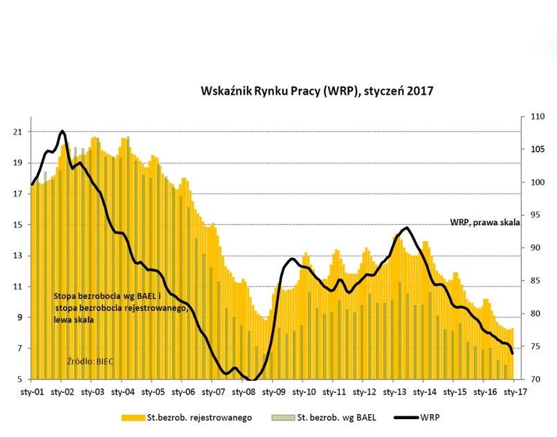 Stopa bezrobocia rejestrowanego po wyeliminowaniu wpływu czynników sezonowych od drugiej połowy 2013 roku systematycznie się zmniejsza. W grudniu 2016 r. stopa bezrobocia rejestrowanego wzrosła o 0,1 pkt proc. i wyniosła 8,3 proc., jednak po wyeliminowaniu wpływu czynników sezonowych zmalała o nieco ponad 0,1 pkt procentowego i wyniosła 8,2 proc.