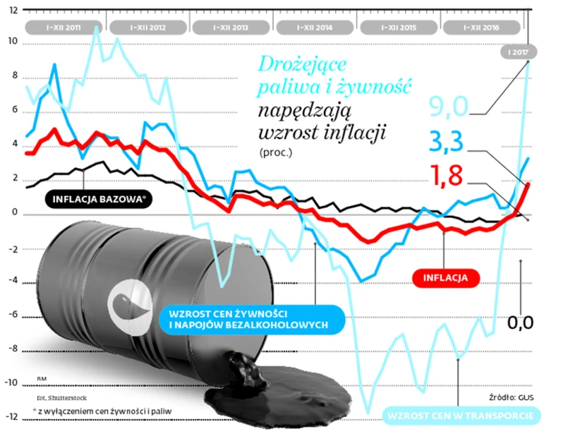 W styczniu baryłka ropy brent kosztowała nawet 58 dol., rok wcześniej notowana była poniżej 30 dol. Tak znaczący wzrost spowodował, że wskaźnik cen w kategorii transport podskoczył o 9 proc. w ciągu roku, najwięcej od pięciu lat. Wpływ na to mają przede wszystkim wyższe ceny paliw na stacjach benzynowych – z danych Polskiej Izby Paliw Płynnych wynika, że za olej napędowy płacimy o 23 proc. więcej niż przed rokiem, a etylina 95 podrożała o 17 proc. Ceny żywności i napojów bezalkoholowych poszły w górę o 3,3 proc. To czteroletni rekord.