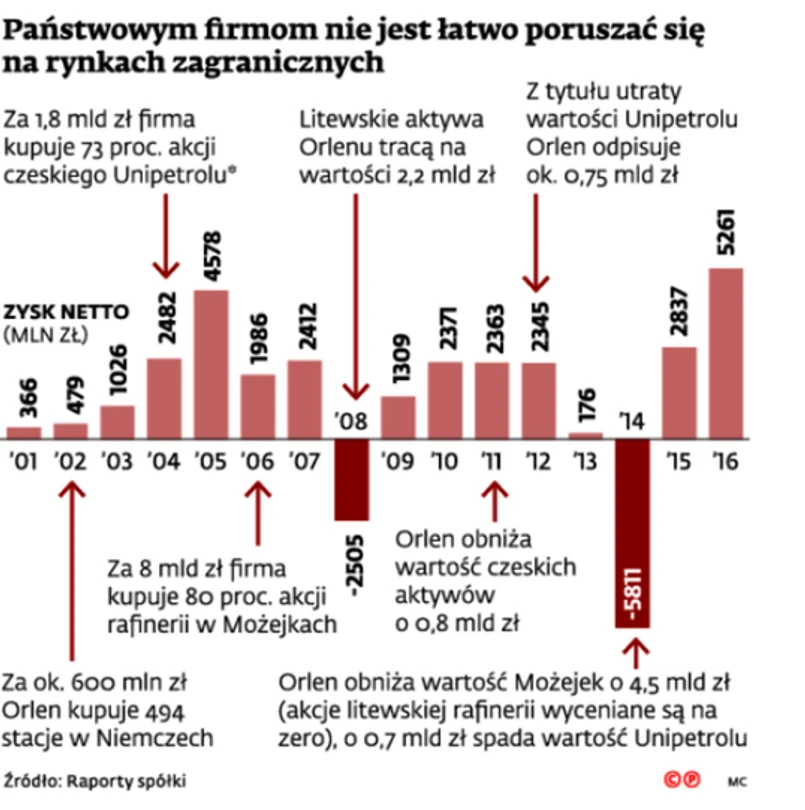 Na liście spektakularnych zagranicznych porażek polskich przedsiębiorstw lubiński koncern, jeśli wziąć pod uwagę wielkość straty, znalazł się na mało zaszczytnym pierwszym miejscu. Dotychczas palmę pierwszeństwa dzierżył PKN Orlen. W 2006 r. największy krajowy koncern paliwowy przejął kontrolę nad litewską rafinerię w Możejkach. Na kupno aktywów i dalsze inwestycje polska firma wydała ok. 10 mld zł. Do odciętej przez Rosjan od dostaw surowca rafinerii Orlen zmuszony jest sprowadzać ropę statkami z Wenezueli, a jednocześnie przed kilkoma laty litewski rząd rozebrał tory najkrótszej linii kolejowej prowadzącej do portowych terminali. To znacznie zwiększa koszty. Zyski Możejki przynoszą okazjonalnie, tylko w wyjątkowo sprzyjających warunkach rynkowych. Takich jak w 2015 i 2016 r., kiedy łącznie zarobiły dla Orlenu niemal 0,5 mld dol. Dlatego poprzedni zarząd firmy, kierowany przez Jacka Krawca, spisał litewskie aktywa na straty i próbował sprzedać rafinerię. Wojciech Jasiński, obecny prezes firmy, w wywiadzie dla „Rzeczpospolitej”, mówił o chęci „rozwijania działalności na Litwie”.