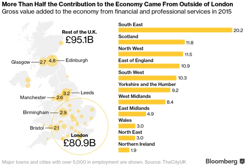 Chociaż media i eksperci koncentrują się na potencjalnym odpływie pracowników sektora finansowego z Londynu, zagrożone mogą być także miejsca pracy w innych miastach Wielkiej Brytanii. Z regionów, które poparły wyjście kraju z UE; wyjątkiem były jedynie Londyn, Szkocja i Irlandia Płn.