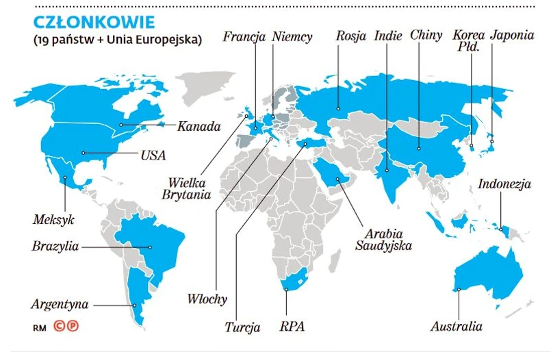 Co więcej, G20 nie zrzesza wszystkich największych gospodarek świata. Gdyby trzymać się kryterium produktu krajowego brutto, do klubu musiałaby należeć chociażby Hiszpania, pod względem wartości PKB 14. gospodarka świata. Ścisłe przestrzeganie tych kryteriów oznaczałoby również, że na coroczne spotkania przywódców G20 jeździłby premier Holandii, która z PKB w wysokości 750 mld dol. jest 17. gospodarką. Wypadłaby z niego za to Argentyna, która pod względem PKB plasuje się na 21. pozycji na świecie, a przede wszystkim Republika Południowej Afryki, której 314 mld dol. daje 32. pozycję, osiem oczek niżej niż Polska.