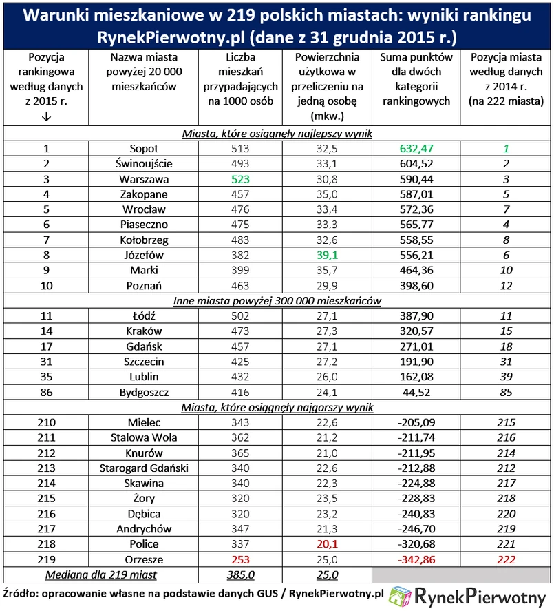 Powyższa tabela prezentuje również pozycje, które poszczególne miasta zajęłyby po uwzględnieniu danych GUS-u z 2014 r. Takie porównanie potwierdza brak bardzo dużych zmian wśród metropolii oraz miejscowości uzyskujących najlepsze i najgorsze wyniki. Starsze dane GUS-u dodatkowo wskazują, że pomiędzy 2014 r. i 2015 r. przeciętna powierzchnia użytkowa przypadająca na 1 osobę w miastach powyżej 20 000 mieszkańców, wzrosła z 24,7 mkw. do 25,0 mkw. Analogiczne wyniki obliczone dla całej Polski, wynosiły 26,7 mkw. (2014 r.) i 27,0 mkw. (2015 r.). W analizowanych miejscowościach, odnotowano również wzrost przeciętnej liczby mieszkań na 1000 osób (z 381 w 2014 r. do 385 w 2015 r.). Analogiczny wzrost średniej dla całej Polski, wyniósł około 4 mieszkania/1000 osób (363,4 - 2014 rok, 367,3 - 2015 rok).
