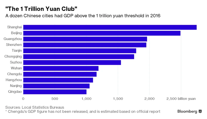 W ubiegłym roku produkt krajowy brutto obu miast (Nankin i Qingdao) przekroczył 1 bln juanów (około 146 miliardów dolarów). Tym samym dołączyły one do gospodarczej elity miast Państwa Środka. Obecnie w Państwie Środka ekskluzywny klub z PKB powyżej 1 bln juanów tworzy 12 miast, które łącznie wypracowały ponad jedną czwartą PKB Chin w 2016 roku. Według obliczeń agencji Bloomberg, łączne PKB chińskiej dwunastki było większe od całej gospodarki Francji wartej 2,4 biliona dolarów.
