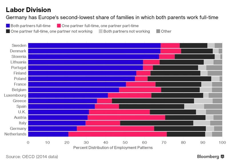Obecnie Niemcy są drugą po Holendrach nacją w Europie z najniższym udziałem rodzin, w których dwójka rodziców pracuje w pełnym wymiarze godzin.