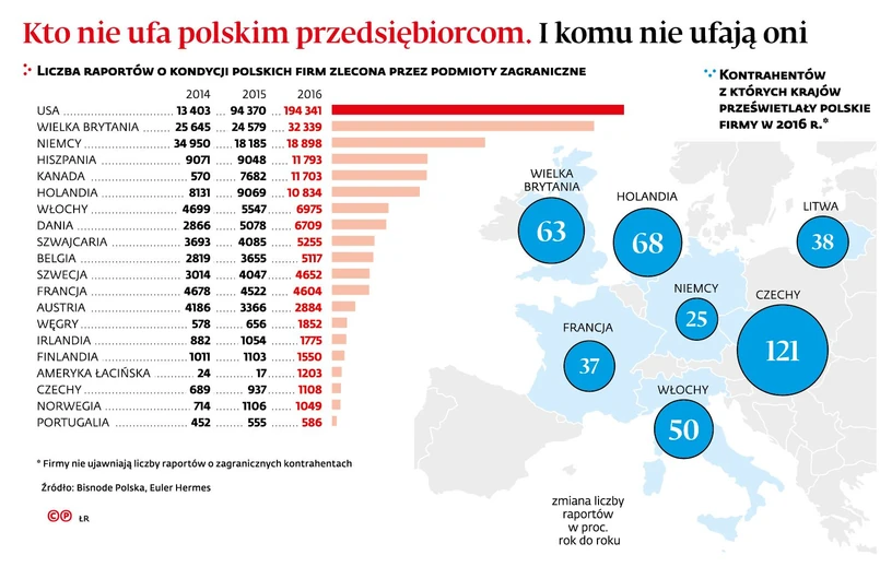Tomasz Starzyk, analityk Bisnode, tłumaczy ten wzrost rosnącym zainteresowaniem inwestycjami w Polsce. Firmy z zagranicy, wchodząc na nasz rynek, sprawdzają potencjalnych kontrahentów. Z zestawienia wywiadowni wynika, że najbardziej „ciekawscy” są Amerykanie. W 2016 r. poprosili o 194,3 tys. raportów dotyczących polskich firm – o 105 proc. więcej niż rok wcześniej.