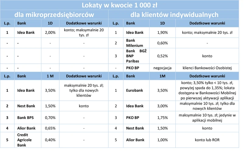 Wyróżniliśmy 5 pierwszych lokat ze względu na najwyższe oprocentowanie z podziałem na lokaty dostępne w ramach firmowego konta lub poza nim, uwzględniając w poniższych rankingach również dodatkowe warunki ograniczające zysk. Przy oszczędnościach firmowych do 20 tys. zł sześć na siedem razy wygrał Idea Bank.