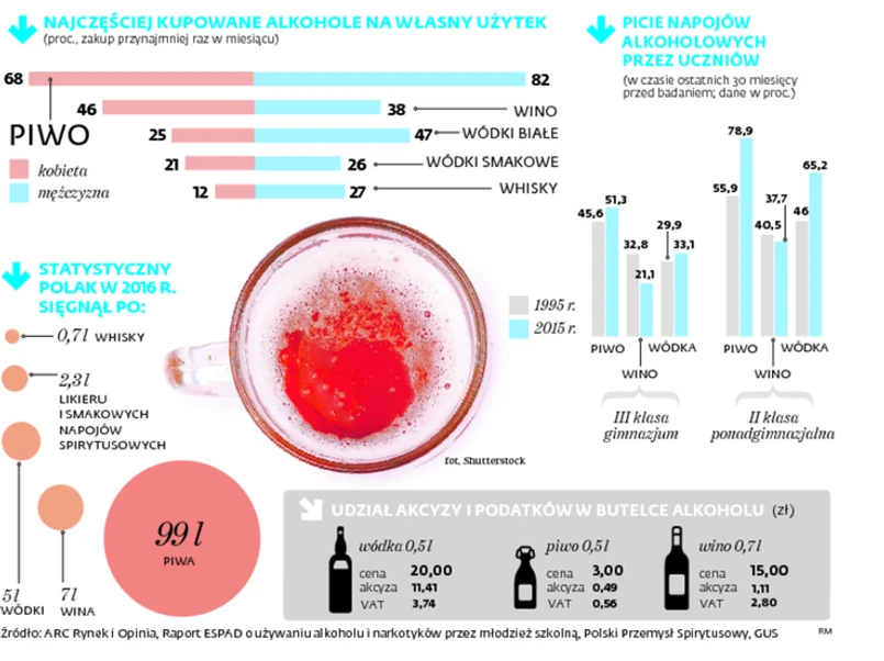 Potwierdza to Europejski Program Badań Ankietowych ESPAD z 2015 r. Na pytanie, czy w ciągu ostatniego miesiąca sięgałeś o alkohol, 78,9 proc. uczniów drugich klas ponadgimnazjalnych odpowiedziało, że piło piwo; 37,7 proc. – wino; 65,2 proc. – wódkę.