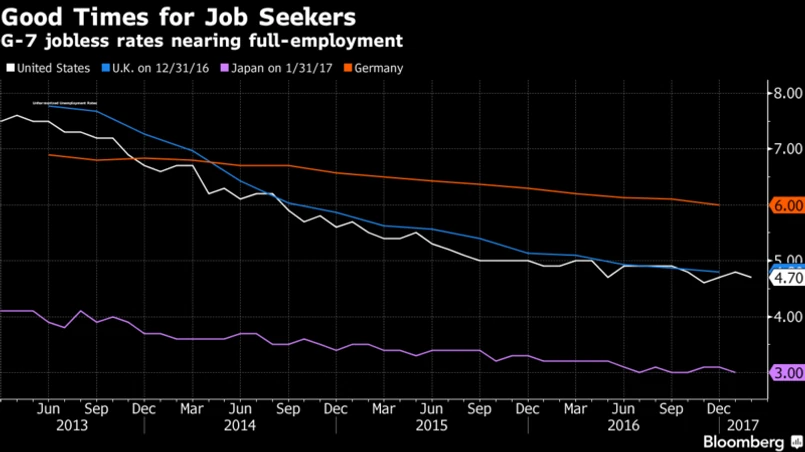To dobry moment na szukanie pracy w krajach rozwiniętych. Stopa bezrobocia w 7 najbogatszych krajach (wśród nich są Kanada, USA, Wielka Brytania, Japonia i Niemcy) znajduje się na poziomie (lub nawet poniżej), który skłania ekspertów do używania określenia „rynku pracy wyczerpania”.