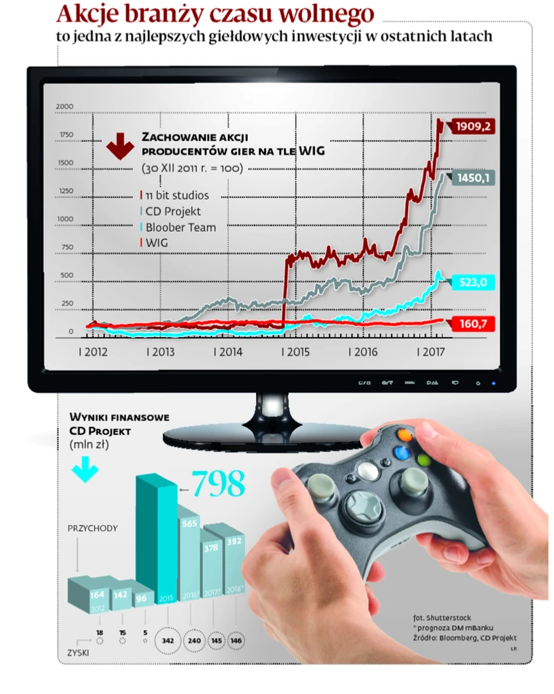 Za sprawą sukcesu CD Projektu inwestorzy zwrócili uwagę także na innych producentów gier notowanych na GPW. Akcje 11 Bit Studios podrożały w ostatnich pięciu latach o 1700 proc., Vivid Games poszedł w górę 1500 proc. w tym samym czasie. Pod względem wartości rynkowej to jednak firmy od CD Projektu mniejsze o ponad 90 proc.