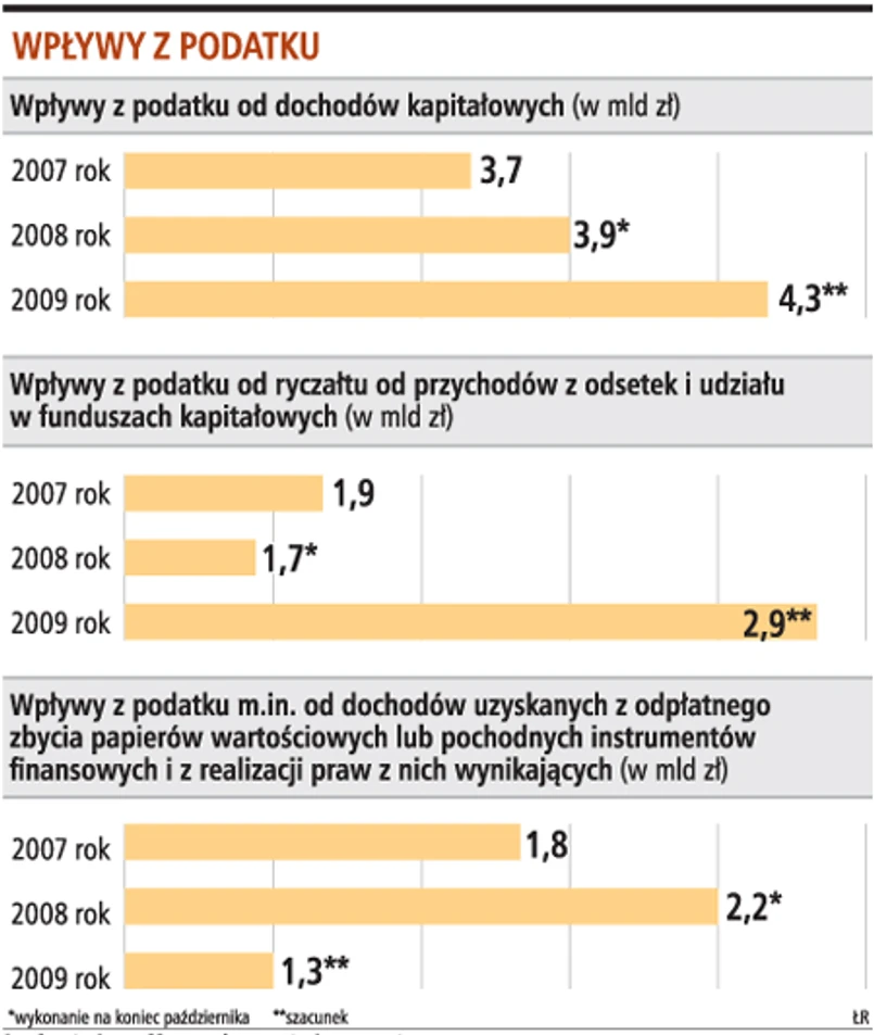 Resort finansów uwzględnił ten wzrost w swoich prognozach. Założył, że wpływy ze zryczałtowanego podatku Belki - czyli od odsetek i jednostek funduszy inwestycyjnych - w przyszłym roku będą większe niż wcześniej i zrównoważą spadek wpływów z podatku od zysków z akcji. W przyszłorocznym budżecie dochody z podatku od zysków kapitałowych zostały zaplanowane na 4,3 mld zł. Do końca października tego roku ten podatek przyniósł państwu 3,9 mld zł.