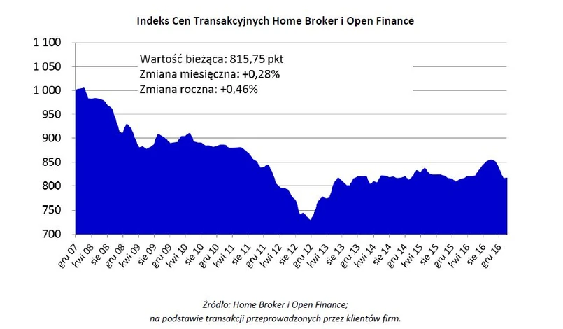 815,75 pkt, o 0,46 proc. więcej niż rok temu – to najnowszy odczyt Indeksu Cen Transakcyjnych Home Brokera i Open Finance, wskaźnika który powstaje na podstawie transakcji mieszkaniowych dokonanych przez klientów obu firm. W ostatnim miesiącu indeks wzrósł o 0,28 proc. Aktualne notowanie IDK obejmuje transakcje dokonane w ostatnich trzech pełnych miesiącach, przy czym te nowsze mają w wyliczaniu wskaźnika wyższą wagę.