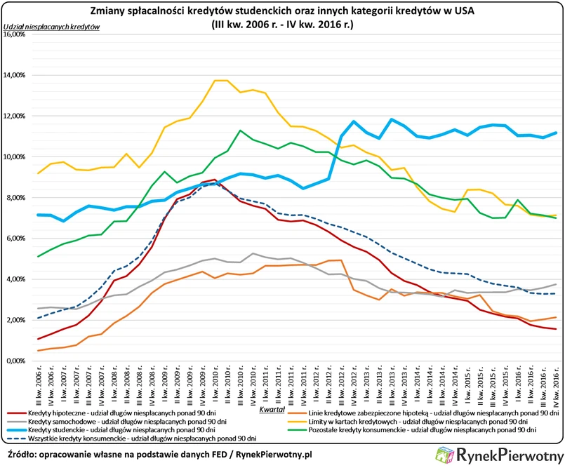 Problemy amerykańskich absolwentów znajdują przełożenie w statystykach dotyczących spłacalności kredytów. Poniższy wykres przedstawia udział kredytów gospodarstw domowych, które posiadają opóźnienie w spłacie wynoszące przynajmniej 90 dni (dane od III kw. 2006 r. do IV kw. 2016 r.). Nietrudno zauważyć, że po krytycznych latach 2009 - 2010, wyraźnie poprawiła się jakość kredytów spłacalnych przez amerykańskich konsumentów. Jedyny wyjątek dotyczy właśnie kredytów studenckich (patrz pogrubiona linia na wykresie). W III kw. 2006 r. około 7,2% takich kredytów cechowało się opóźnieniem w spłacie wynoszącym przynajmniej 90 dni. Analogiczny wynik z IV kw. 2016 r. wynosił już 11,2%. Jeszcze bardziej niepokojące dane Departamentu Edukacji sprzed roku wskazują, że wówczas 43% posiadaczy kredytów studenckich nie spłacało długu ze względu na rozpoczętą upadłość konsumencką, przejściową niewypłacalność albo ugodę z wierzycielem (skutkującą np. odroczeniem spłaty). Wielu młodych Amerykanów próbuje ratować swój budżet domowy poprzez odraczanie spłaty kredytu na studia. Taka sytuacja skutkująca dodatkowym wzrostem zadłużenia, oczywiście nie może trwać wiecznie. Trzeba również zdawać sobie sprawę, że po podwyżkach stóp procentowych zapowiadanych przez FED, raty wielu kredytów studenckich wzrosną.