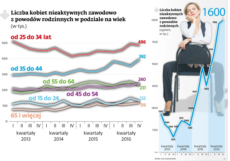 To dane z badania BAEL, jakie cyklicznie prowadzi GUS, dotyczące IV kwartału 2016 r. Wynika z nich, że grupa kobiet, które nie pracują, bo poświęcają się rodzinie i prowadzeniu domu, rosła. Od początku października do końca grudnia powiększyła się o 8 tys. w porównaniu z kwartałem wcześniej. W sumie w ciągu całego poprzedniego roku kobiet biernych zawodowo z powodów rodzinnych przybyło 148 tys. Po dołożeniu 2015, kiedy zaczął się ten proces, przybyła armia niemal 240 tys. kobiet niepracujących zawodowo (w 2015 r. rodzinne przyczyny zdecydowały o odejściu z pracy 91 tys. pań).