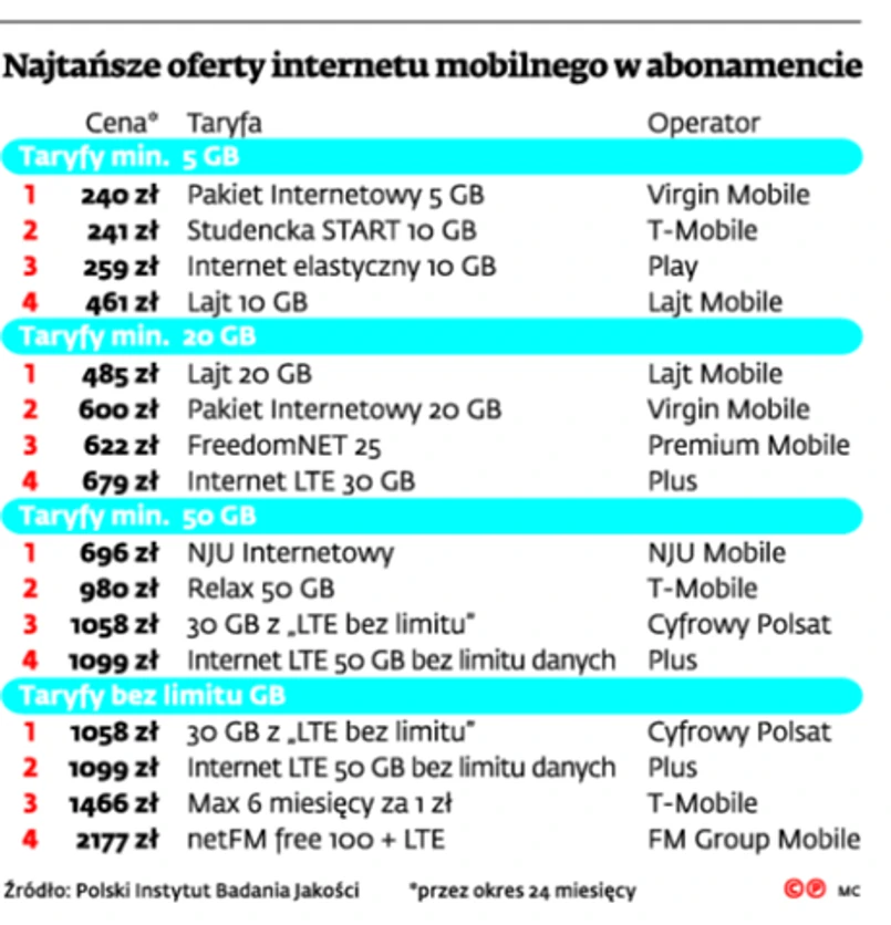 Przykład? Abonamentowa oferta Play za 79,90 zł miesięcznie reklamowana jest w internecie jako „bez limitu GB”. Po najechaniu kursorem na małe „i” w ofercie wyskakuje informacja, że internet zwalnia po przekroczeniu 100 GB. To samo jest w Orange. Największy polski telekom ofertę internetu mobilnego (LTE dla domu za 79,90 zł) reklamuje jako „bez limitu danych”, ale w szczegółach, na kolejnej podstronie wyjaśnia, że po przekroczeniu 150 GB prędkość transferu w strefie domowej spada do 1 Mb/s. – Jeszcze niedawno podobny zapis w umowach miał T-Mobile. Teraz zapisu już nie ma – mówi Krzysztof Podwójcic, z Polskiego Instytutu Badań Jakości. Firma przeanalizowała oferty 14 dostawców internetu LTE na abonament. Badała nie tylko ceny abonamentów, lecz także jakość obsługi infolinii. Z raportu wynika, że najkorzystniejsze oferty mają operatorzy wirtualni, a więc tacy, którzy nie mają własnej infrastruktury, jak Virgin Mobile. Wśród ofert nielimitowanych, a więc najdroższych, najlepiej wypadł internet od Cyfrowego Polsatu. Co ciekawe, należące do Zygmunta Solorza-Żaka Plus i Cyfrowy Polsat już zostały w przeszłości ukarane przez UOKiK za kłamstwo w reklamie „nielimitowanego LTE” – kwotą 40 mln zł.