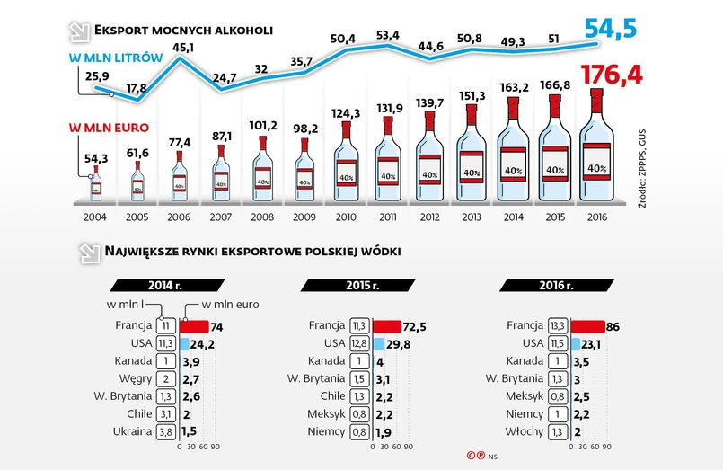 Od czasu wejścia Polski do UE można mówić o podwojeniu eksportu pod względem ilości i ponadtrzykrotnym jego wzroście pod względem wartości. – To przejaw stabilizacji. Po podwyżce akcyzy na napoje spirytusowe od stycznia 2014 r. producenci z konieczności ograniczyli eksport. Musieli się skupić na krajowym rynku, na którym sprzedaż zaczęła spadać. Dopiero ubiegły rok przyniósł 2–3-procentowe odbicie – mówi Iga Wasilewicz, rzeczniczka prasowa Związek Pracodawców „Polski Przemysł Spirytusowy”.