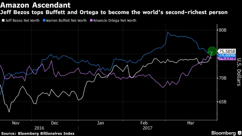 Bezos powiększył własną fortunę o 1,5 mld dol. w ciągu chwili, po tym jak wartość należącego do niego Amazona wzrosła o 18,32 dol. na akcję w reakcji inwestorów na informację, że gigant branży e-commerce zamierza kupić internetowego detalistę Souq.com. Bezos posiada obecnie majątek netto na poziomie 75,6 mld dol., co jest wynikiem o 700 mln dol. lepszym, niż w przypadku należącego do Buffetta Berkshire Hathaway Inc. oraz o 1,3 mld dol. wyższym, niż majątek założyciela Inditexu Amancio Ortegi (który jest najbogatszym człowiekiem na Starym Kontynencie).