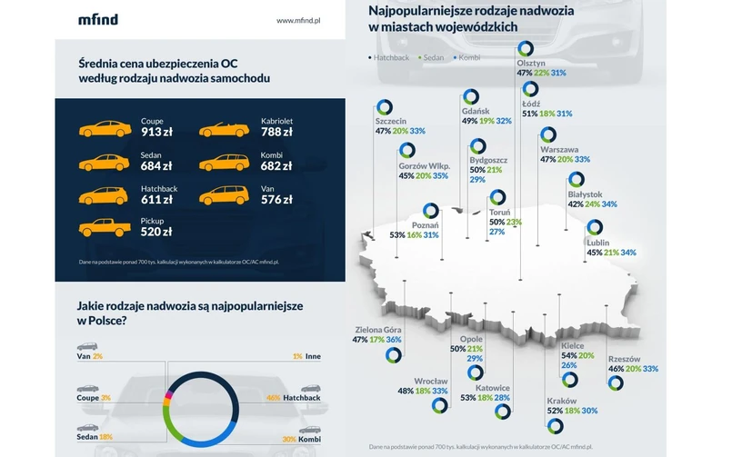 A jak rozkłada się popularność poszczególnych typów nadwozia w największych polskich miastach. Od morza aż do Tatr i od Świecka do Terespola, najwięcej kalkulacji dotyczyło pojazdów typu hatchback. Szczególnie popularne są one w Kielcach, gdzie aż 54% wszystkich wyliczeń dotyczyło takich aut. Z kolei sedany są najpopularniejsze w Białymstoku (24%), a kombi w Zielonej Górze (36%).