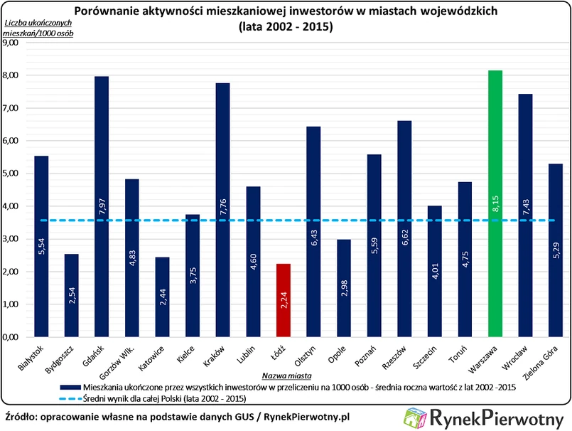 Zupełnie inna sytuacja panuje na terenie Bydgoszczy, Katowic, Łodzi oraz Opola. W tych czterech miastach, przeciętna roczna liczba mieszkań oddawanych na 1000 osób (2002 r. - 2015 r.), nie przekroczyła nawet ogólnopolskiej średniej (3,57). Co ciekawe, najniższy wynik odnotowano w Łodzi, czyli metropolii plasującej się na podium pod względem liczby ludności (po Warszawie i Krakowie).