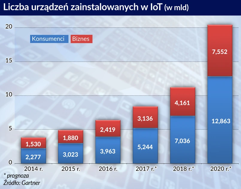 Redukcja oczekiwań to efekt wolniejszego niż prognozowano rozwoju IoT nie tylko w biznesie, ale także na rynku konsumenckim. Popularność wszelkiego rodzaju galanterii elektronicznej, takiej jak opaski do fitnessu, kamery osobiste i inteligentne zegarki, zdecydowanie mniejsza niż przewidywali analitycy. Przyczynami tego stanu rzeczy są m.in. obawy związane z prywatnością użytkowników oraz ograniczona przydatność takich gadżetów. Według Ericssona w końcu ubiegłego roku w internecie rzeczy działało 5,6 mld urządzeń, z czego tylko ok. 400 mln współpracowało z sieciami mobilnymi, a pozostałe w sieciami bliskiego zasięgu takimi jak Wi-Fi, Blutooth czy ZigBee.